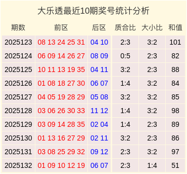 大乐透2025132期开奖,本期奖号:前区01、09、10、12、19,后区06、07。其中前区奖号质合比为2:3,大小比为1:4,和值为51。